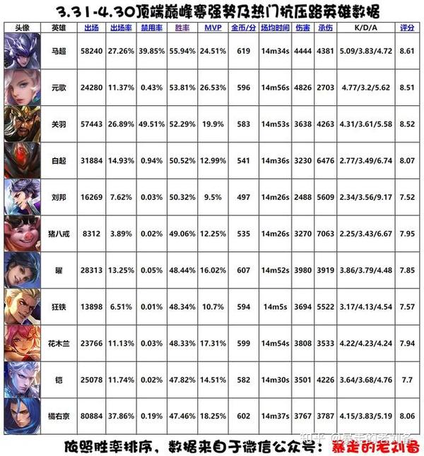 但是,元歌出场率下降,关羽禁用率上升(间接导致出场率下降),马超则是禁用率下降(间接导致出场率上升),可以这么说,顶端局必抢的边路是关羽、马超。