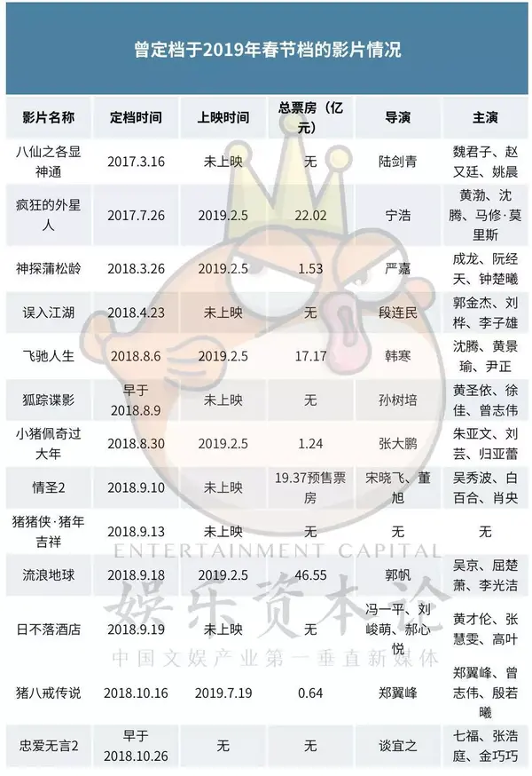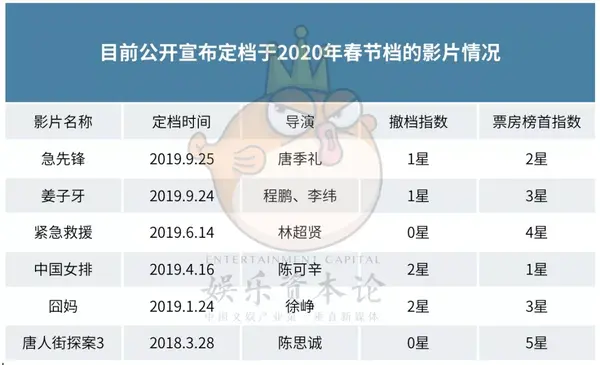 因为现在离春节档仍有4个月之久,就如同定档情况一样,仍存在大量变数,以下皆是河豚君一家之言,请勿见怪。