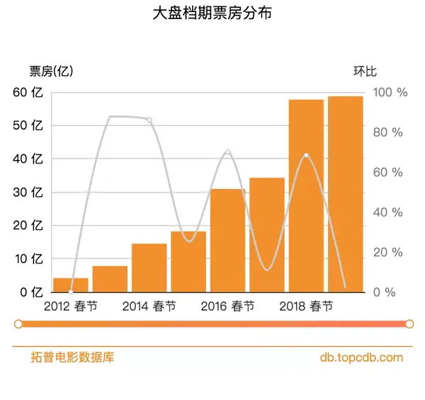 根据拓普数据,从2012年开始春节档的总票房呈急速上升的趋势,虽然今年春节档同比增长率仅有1.77%。