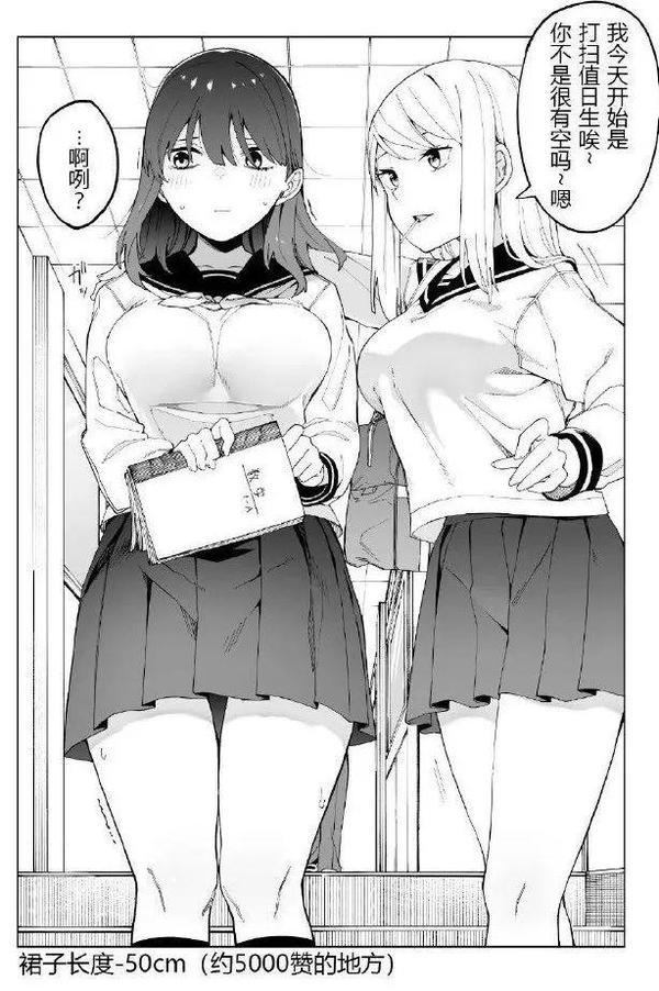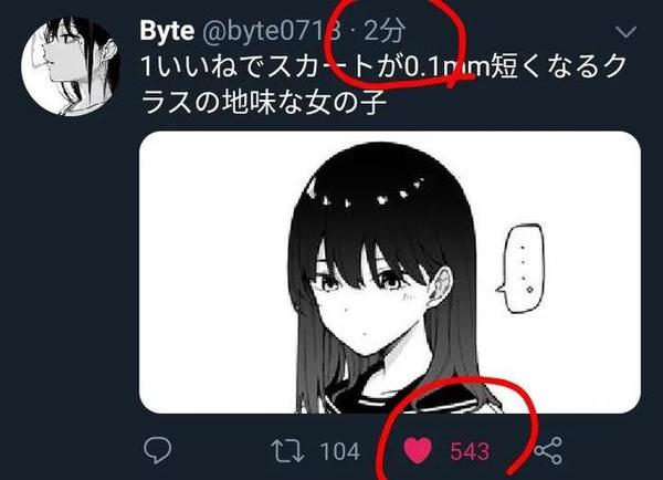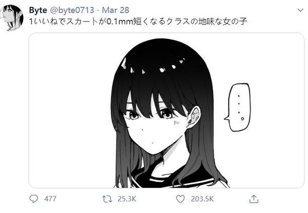 此前,漫画家Byte在推特上发布了一张穿着长裙校服的JK,并标注了玩法:“点一个赞就能让这个土妹子的裙子缩短0.1毫米。